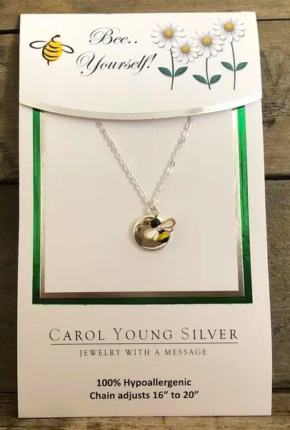 A sweet, little bee is perched at the edge of a simple, silver disk. Packaged on a card with the message tag line, “Bee . . Yourself” makes this the perfect gift. Features yellow, black and white enamel, accented with Cubic Zirconia and gold tone outline. 100% HYPOALLERGENIC Chain adjusts 16″ to 20″. By Carol Young Silver